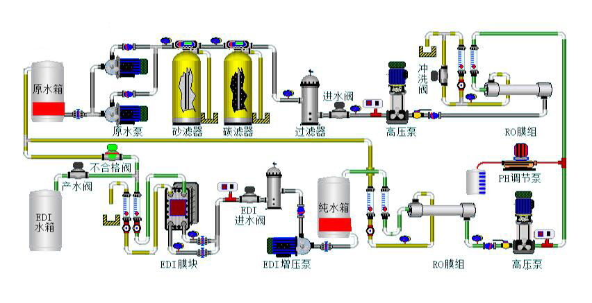電鍍廢水處理分為三類,一類是自然循環(huán),一類是強(qiáng)制閉路循環(huán),一類是處理后排放。強(qiáng)制閉路循環(huán)又可分為薄膜蒸發(fā)法、反滲透法、離子交換法三類,銘豐今天帶大家了解反滲透法的工藝流程:自來水→ 儲水箱→原水泵→沙濾器→碳濾器→精密過濾器→反滲透主機(jī)→純水箱。把逆流漂洗的漂洗水引入反滲透裝置,經(jīng)反滲透處理后,濃水進(jìn)行回收,返回鍍槽,淡水返回漂洗槽,構(gòu)成閉路循環(huán)系統(tǒng)。處理過程中反滲透器只消耗一定的動力,無二次污染,節(jié)省能源,是處理電鍍廢水比較理想的技術(shù)裝備。